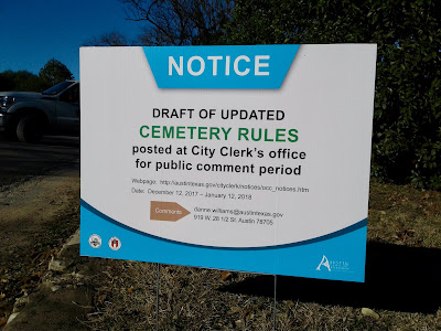 The only other public notice I have seen is a single small sign posted at AMP (a photograph of the sign is included). The sign references a URL, http://austintexas.gov/cityclerk/notices/ occ_notices.htm," which opens a website entitled “View Land Development Rules Notices posted on or after January 1, 2016.” However, nothing in that page refers expressly to the proposed cemetery rules and regulations. Instead, the link to the proposal is entitled “Notice of Proposed Rule - Rule No. R161-17.17 (Received 12/11/2017).” Yet, the sign fails to include the proposed rule number. A citizen wishing to make public comment and unaware of the rule number could reasonably assume that the posted URL is incorrect and thereby be discouraged from making public comment. Further, the sign states that the public comment period is from “December 12, 2017—January 12, 2018.” However, the e-mailed notices I have received from PARD state that the notice period ends January 11, 2018. This is contradictory and confusing; a citizen depending on the sign may actually miss the comment period by a single day.